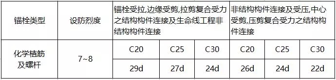當(dāng)基材厚度不足時應(yīng)植穿,做法詳"端部植筋大樣",抗震錨固連接錨栓的最小有效錨固深度應(yīng)滿足下表的規(guī)定: